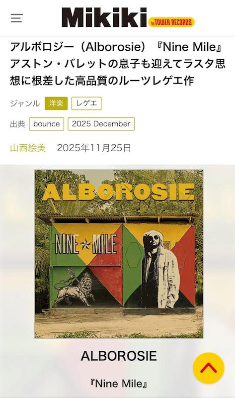 『NINE MILE』は2023年『DESTINY』以来となるALBOROSIEの最新アルバム。タイトル『NINE MILE=ナイン・マイル』はBOB MARLEYの生誕の地、その遺骨が安置された霊廟があるジャマイカ・セントアン教区の地名。ラスタファリアンの文化とも深い結び付きがある地区でもあり、そのコミュニティでのゆったりと時間が流れる生活や、自然に囲まれた環境はルーツ・レゲエの根底に存在するアフリカの精神や文化が反映されている。