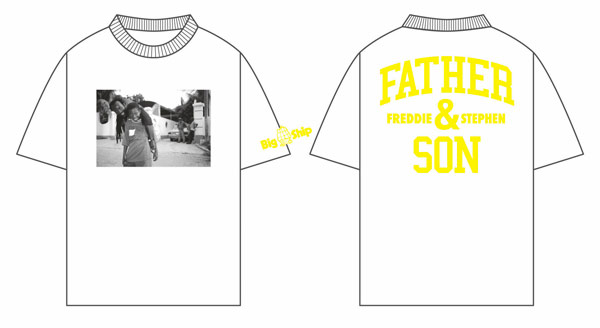 90年代後半に〈BIG SHIP〉スタジオの前で、デザイナー/茂呂千里氏によって撮影されたモノクロ写真を使用。まだ現在のように「天才」と呼ばれる以前の幼いスティーヴンと、若きフレディとの親密で愛情溢れる表情が素晴らしい写真。実の「父と息子」としてだけでなく、「レゲエの師弟関係」、また両者の名前のイニシャルの「F」と「S」を掛け合わせたアイディアで構成された作品となっています。裏面はイエロー。FREDDIEからSTEPHENに受け継がれる〈BIG SHIP〉のレコード・レーベル・カラー。袖にも同色で正規ロゴ入り。襟ネームはRICE & PEAS。