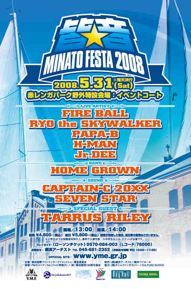 そのイヴェントは、5月31日の土曜日に、横浜/赤レンガパークで開催される『皆音/MINATO FESTA 2008』。出演予定はトーラス・ライリー以外に、ファイヤー・ボール、リョー・ザ・スカイウォーカー、パパ・B、H・マン、ジュニア・ディー、ホーム・グロウン、キャプテン・C20XX、セヴン・スター他。野外イヴェントです。詳しくは「www.yme.gr.jp」までヨロシク。