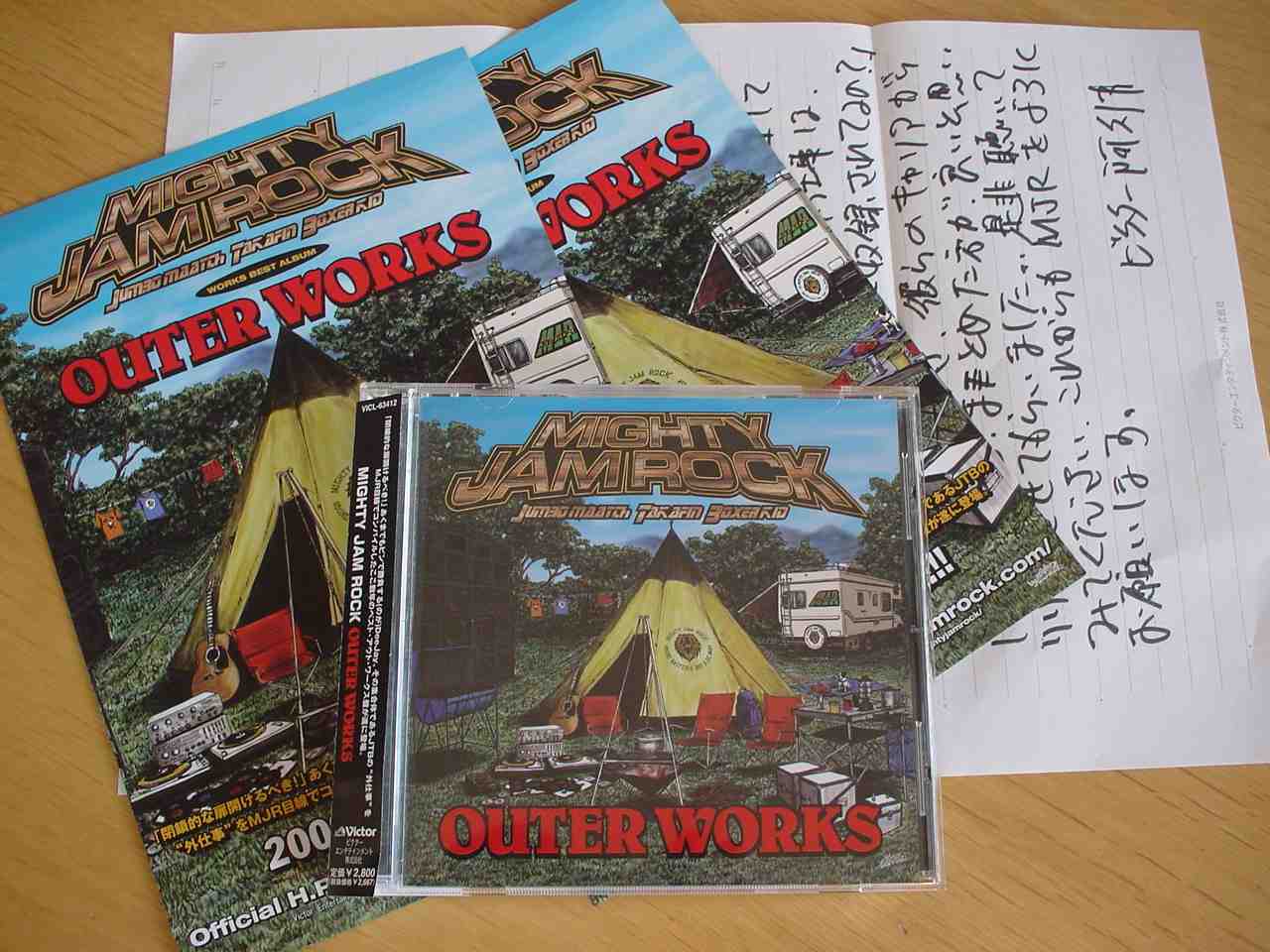 で、頂いたブツは『MIGHTY JAM ROCK / OUTER WORKS』。マイティ・ジャム・ロックのJTB(ジャンボ・マーチ/タカフィン/ボクサー・キッド)が、これまでに他のアーティストの作品にフューチャリング参加した曲や、コンピレーションに参加した曲の中からの「ベスト・アウト・ワークス盤」。ジャケットは勿論、ムラサキ画泊。今回も「そりゃ、アンタ、肩こりも酷くなるでしょ」と言いたくなるぐらい描きまくっている。グズな自分としてはこれまたチト痛タタタ。うん、みんな仕事してんな〜、と眩しくなる。