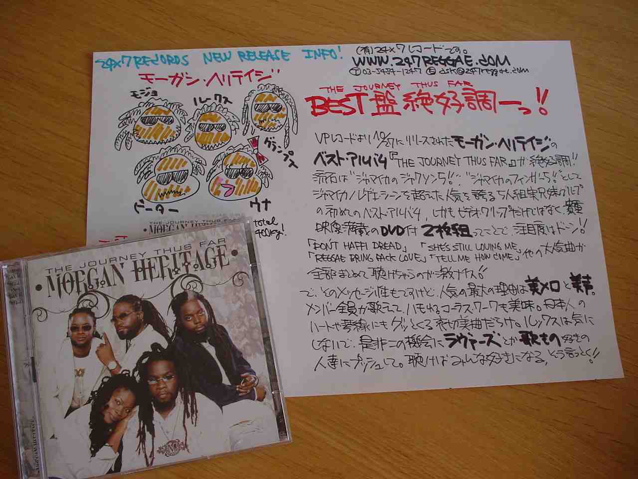 で、ヨロシクと言えば、US現地の昨日にVPからモーガン・ヘリテイジの2枚組ベスト盤『THE JOURNEY THUS FAR』がリリースされました。ベスト選曲のCDと、貴重映像とビデオ・クリップによるDVDの2枚組。まっ、全曲ビッグ・チューンですけど、改めてそのメッセージ性もですけど、ピーターとグランプスを中心としたヴォーカル・ワーク、メロディ・センス、そのオリジナリティをまとめて再確認出来ます。うん、ビギナーにも最適。既に国内入荷が開始されてますので、是非頼みます。