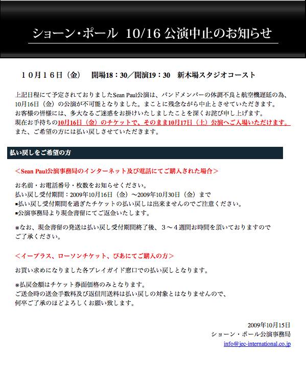 勿論、ウチは主催者/プロモーター等ではありませんが、ショーン・ポールが所属するVPレコードの代理店としての立場で、積極的に公演を告知してきました以上、某かの立場で関わっていた以上、やはりこうしたコトになったのには責任も感じていますし、大変申し訳なく、大変残念にも感じています。重ねて、ご迷惑をお掛け致しましたことをお詫び申し上げます。本当に申し訳ありませんでした。