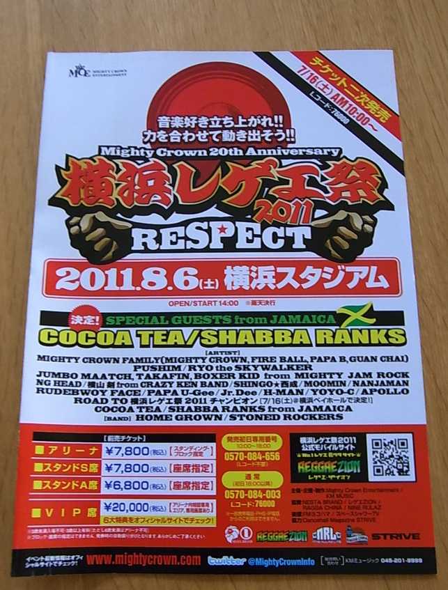 で、アルボロージも「Respect」なら、20周年を迎えた今年のマイティ・クラウンのテーマも「Respect」。で、それを冠タイトルとした今年の「横浜レゲエ祭」もいよいよ来週末開催。で、ウチにも「レゲエ祭なんだけどさ」と色々と仲間達からの問い合わせ多数。今年はシャバ・ランクス&ココ・ティに反応したオッサン仲間達から多数。皆さんの共通イメージは「レゲエ祭=チケット即完売なんでしょ」。「今から取れない?」多数。