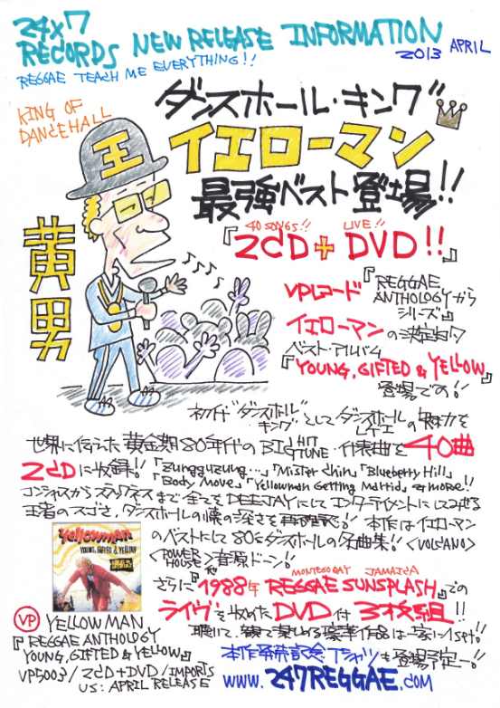 | 一家に一枚、ではなく三枚。 | ![]() 木曜日。 風邪かぁ。 そっかぁ。 へー。 ええ、昨日はそんなコトも気にせずに、鼻水垂らしながらお絵描きしました。 描いていたのは「黄男」。 ああ、直訳しちゃいました、「イエローマン」です。 えー、US4/23にVPの『REGGAE ANTHOLOGY』シリーズから、イエローマンの『YOUNG, GIFTED & YELLOW』が登場します。 REGGAE ANTHOLOGY - YELLOWMAN / YOUNG, GIFTED & YELLOW http://www.247reggae.com/vp/release/1304.html#vp04 で、昨日は、そのサンプル盤も「到着〜」のタイミングでしたので、発送する際の資料代わりのものを作成していた感じです。で、その資料の紙にイエローマンの似顔絵とかを描いていた感じです。勝手に。ええ、別に誰からも「似顔絵描いて」なんて言われていません。。 ただ、そうしたかったのは、それぐらい作品内容が素晴らしかったからです。 シャバ・ランクスやビーニマン以前に、「初代ダンスホール・キング」として、ダンスホールの素晴らしさを世界中に届けた80年代絶頂期のビッグ・チューン&代表曲を2枚のCDに40曲収録! 「ずんぐずんぐ」「ぼでぃ・むーぶ」「ぶるーべりー・ひる」「みすたー・ちん」とかは勿 論、イエローマンとしてだけではなくダンスホールの黄金曲だらけです。 さらに、88年の「レゲエ・サンスプラシュ」のライヴを収めたDVDも付いている文句ナシのクソ豪華3枚組。決定盤的なベスト・アルバム。ええ、全てのダンスホール・マッシヴは「一家に一枚」と言うか三枚。是非ヨロシクです。一生楽しめます。 あと、同作発売記念でTシャツも発売予定でして、そのサンプルも到着。いい感じ。また正式決定次第ご案内します。こちらもヨロシク。 今日はコレぐらいに。 適度な文字量かな、と。 ダメ? へー。 また明日。 そんな感じ。ではでは。 |