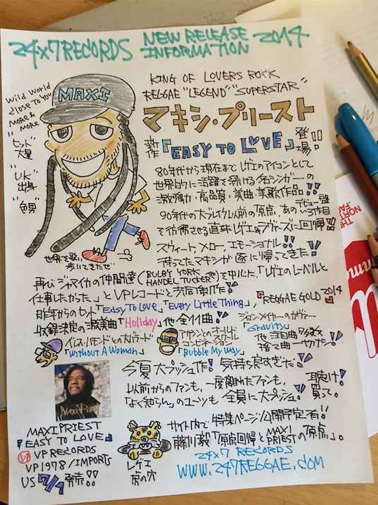 | 「予習済」マーク。 | ![]() 金曜日。 加速。 色々と携わらせて頂いてる案件がどれも加速なう。追い込みなう、とも言うかな。もっと早くやれよ、とも言うかな。とにかく「ココから急ぐどー」が多数。嫌いじゃない。 ギャッピー・ランクスが来日していたコトもなんか「前のコト」。月曜日にイン・ストア・イヴェントをやったばかりなのに。 でも、今回に初めて、ショーとイン・ストアで二回続けてギャッピー・ランクスを生で体感できたコトは個人的にはスゴく大きな収穫。 月曜日のイン・ストア以降に作品を聴き直しているけど、それまでと違って聴こえる感じ。何度も聴いてきた曲が、今回に生で体感したコトで、なんかエナジーみたいなものが追加された感じ、上手く言えないけど。自分なりに吸収していた曲をよりちゃんと「こーゆー曲だったんだ!」と消化できた感じ。もー「Thanks & Praise」や「Shining Hope」とかイントロだけで、なんか気持ちがぎゅーっとくるようになっちゃっているし。 まっ、ショーとかはその場で「楽しかったねー」でいいんでしょうけど、それだけではなくて、「事前に作品を予習して楽しむ」→「ショーを見て楽しむ」→「作品を復習して変わって聴 こえるのを楽しむ」の三段階で楽しむコトを勝手にお勧めします。それによって「楽しみ」の「点」が「線」になって、もっと楽しくなるハズ、とも。と、とってもウザいコト書いてますけど、是非試してみて。 ああ、ウザいついでですけど、今回にモーガン・ヘリテイジの来日記念&ベスト盤『PERFECT BEST SONGS』をリリースしたかったのも、そんなコトを思ったからだったりもします。 MORGAN HERITAGE 『PERFECT BEST SONGS』 http://www.247reggae.com/vp/news/1406.html 「予習したくても、10枚のオリジナル・アルバムを全部買わないといけないの?」「前にベスト盤が出ていたけど、チト古くてあの曲とか入ってないじゃん」な皆さんにお届けしたかったから。で、モーガン・ヘリテイジもですけど、さっきに書いた三段階で楽しめる楽しみ方を提案できるようにしたかったから。 勝手に。 まっ、ココ数年の色々な来日とかあっても、それ中で「自分達の立場で果たすべき役割を全く果たせてないだよな」とずっと情けなく感じていたのもありますけど。サボり過ぎ。 えー、それを実現させてくれる関係各位に感謝です。ウチのサイトでも予約者が増えていて大感謝です。ああ、昨日に特典ステッカーを入稿しました。今日の写真がそれ。サイズとかは全然違うけど。公演の日にはどっかに貼って来て。「予習済」マークとして。発見したらなんかします。 えー、ウザいコト書き過ぎた。ダサいから違う話を。 えー、マキシ・プリースト新作『EASY TO LOVE』がそろそろ日本の店頭にも到着です。既に到着しているところもありますけど、ココから本格化です。行きつけの店頭でアレな場合は店員さんに確認して頂ければ幸いです。 で、USでは今月1日にリリース、現地の今日からの連休に合わせた感じですけど、USでは好発進中。まっ、ビルボードの「レゲエ・チャート1位」はマキシ・プリーストからすると「当たり前」「想定内」だったかもしれませんけど、総合でもトップ50入りしている感じで、コレは好発進です、かなり。やはり、 今作で「みんなが待っていたマキシ」がちゃんと存在しているのはデカいかな、と。 MAXI PRIEST『EASY TO LOVE』 http://www.247reggae.com/vp/news/14072.html#vp01 で、注目は、シングル/単曲単位でも複数曲が同時にチャートを上昇していることで、マキシ・プリーストの言う「人によって好みの曲が分かれるみたいだけど、それによってより多くの人に受け入れられているみたいだ」は事実の様子。 で、国内でも各関係先にサンプル配布とかさせて頂いていますけど、反応がすこぶる良い感じ。ラジオとかも色々流して頂いていて「嬉しい」。でも、やはり番組によって流れる曲が色々と違うのはUSと同様。好みが色々な証拠。サポート頂いている皆さんに大感謝です。 あと、個人的に嬉しいのはマキシ・プリーストの今回の新作のプロモの過程で、色々な人達とリンクできているコト。いつもの仲間達は勿論、新しい人達、あと、なんか「最近ご無沙汰しちゃってるなー」とか「少し距離ができちゃったなー」だった人達との「再会」が多いのが嬉しいとこ。 まっ、オッサン仲間が多いです。今回に藤川さんに書いてもらった当時のマキシ・プリーストを知っていて、当時に一緒に聴いたり、観に行ったりしていた皆さんとかから連絡多いです。 藤川毅〜レゲエ虎の穴・番外編 「原点回帰とMAXI PRIESTの原点」 http://www.247reggae.com/vp/news/14072.html#tora そうした人達が「マキシ、久々だなー」「内容も良いし、ウチでも紹介するよー」としてくれたりとか、「それより元気かー」と言ってくれたり。単純に、素直に、そうした再会が照れ臭いですけど嬉しいです。覚えていてくれたコトも。 で、改めて、音楽とかはそうしたアレがあるな、と。うん、今回