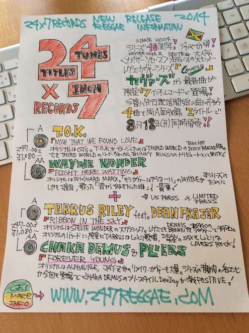 | なんやかんや。 | ![]() 金曜日。 天気イマイチ。 都内はともかく、明日の大阪が心配。「ハイエスト・マウンテン」。今年は行けませんけど、どーか無事に、台風回避できますように。 えー、昨日がヌル過ぎるアレでしたので、今日はサクっとタイトに。 その1。 予告させて頂いてました『COVERS』の7インチの告知をアップしました。2タイトル同時発売。両A面で4曲。ええ、「2枚」「4曲」「7インチ」で、リリースは「24x7」。 『COVERS』新作特集ページ http://www.247reggae.com/247/news/1403.html 24x7-002 T.O.K. / Now That We Found Love WAYNE WONDER / Right Here Waiting 24x7-003 TARRUS RILEY feat. DEAN FRASER / Ribbon In The Sky CHAKA DEMUS & PLIERS / Forever Young 全国各店で18日(月)発売開始。 弊社ショッピング・サイトも18日(月)発売開始。 http://247reggae.shop-pro.jp/ DUB STOREでは先行予約開始中。 http://www.worldreggaenews.com/article.php?category_id=0&article_id=4194 その2。 予告させて頂いてました弊社ショッピング・サイトでの「ガレージ・セール」を18日(月)から開始します。上記の7インチと同じ日です。引き続き「ご購入総額5000円以上で送料無料」キャンペーンを実施していますので、ご活用頂ければ幸いです。 24x7 RECORDS ショッピング・サイト http://247reggae.shop-pro.jp/ で、事前に確認ですが、「ガレージ・セール」商品は本商品生産の際の「サンプル品」です。本商品とボディ・カラー&プリント・カラーが異なるものもあります。「ネーム」「サイズ表記」が付いていないものもあります。また、「ガレージ・セール」商品に関しては返品を受け付けません。事前にご了承下さい。ほぼ「一点もの」です。ダブ・プレート感覚で是非。全て一律で「税込定価1,080円」で販売します。お楽しみに&ヨロシクお願いします。 で、昨日はこの「ガレージ・セール」に向けて準備。まとめてあったサンプル品をまとめてチェック。ついでに「他にも分けて置いてなかったかな?」もまとめてチェック。長年開けてなかったダンボールも開封。懐かしいブツが出てきたりして「あっ」「おっ」「わっ」。それに見入ったりしていて、全然はかどらず。「2時間ぐらいかな」と読んでいた作業時間も7時間。5時間は関係ないものに見入っていた感じ。 で、プロモーション用で作った懐かしいTシャツとかも出てきて「おーっ」。2000年の『MIGHTY CROWN TRIBUTE TO VOLCANO - HENRY ‘JUNJO’ LAWES』とか、2001年の『MIGHTY CROWN / DANCEHALL RULERS 2001』のプロモ用のTシャツとかも。 『TRIBUTE TO VOLCANO - HENRY ‘JUNJO’ LAWES』 http://www.247reggae.com/catalog/compi/MC.html#2000 『DANCEHALL RULER 2001』 http://www.247reggae.com/catalog/compi/MC.html#2001 で、途中で「疲れた〜」となった時にそれの写真をパシャして、facebookとかにアップしたら、今日までにメールとかで「それもガレージ・セールに出しますか?」「先に売ってくれませんか?」とか連絡多数。関係者&仲間達からも。で、「誤解を招くようなコトをしてゴメン」。プロモ用なので無理。どーかご理解を。 ああ、で、フト思ったんですけど、CDとかレコードで「再発」ってあるじゃないですか? Tシャツの「再発」ってあまり聞かないですよね? そーゆーのってどーなんでしょーか? 個人的には「有りでしょ?」なんですけど、そーではない? なんか「当時のアレを現在にアレしました」ではなくて、「当時のまんま」で再発するTシャツもいいいかな、と。ご意見希望。それと「有りですよ」の場合で、「アレが欲しいよ」の場合はそれもご意見ヨロシクです。 その3。 最後。「横浜レゲエ祭 2014 - One Link」まで一ヶ月で、モーガン・ヘリテイジ来日までもう少し。モーガン・ヘリテイジは現地の昨日にNYのタイムズ・スクエアのBB KINGでライヴ。とにかくツアーの多い人達ですけど、現在はUS東海岸をツアー中。その勢いのまま日本に向かうことになります。 9/7 横浜レゲエ祭 2014 - One Link http://www.yokohamareggaesai.com/2014/ で、「横浜レゲエ祭」は野外でチケット販売枚数も多いので対応が効きますけど、その翌日の東京、翌々日の大阪での単独公演の方は、チケット枚数も限られていて、現状どちらも残り僅かです。どちらも「2nd SHOW」は完売で、「1st SHOW」も残り僅か。もし、検討しているのなら、早く動いた方が賢明です。急いだ方がいいです。あと、予約にキャンセルが出る場合もありますので、仮に全て完売になっても、チェックは続けて下さい。 9/8 billboard LIVE東京 9/9 billboard LIVE大阪 http://www.billboard-live.com/ で、単独公演も見逃せない機会ですけど、「横浜レゲエ祭」公演もそれとは別のものになるのでお見逃し無く。行ける方はどらちも確認して欲しいです。単独公演の価格とかアレなユーツは「横浜レゲエ祭」は無理してでも、金借りてでも見ておいて欲しいです。ええ、金や時間は後から調整効きますけど、ライヴやショーはそうはいかないので無理してでも見て欲しいです。いずれにしても、早めにチケットをゲットしておいて。で、準備には『PERFECT BEST SONGS』を。こちらも消化が「早っ」なので、見つけたらゲットし