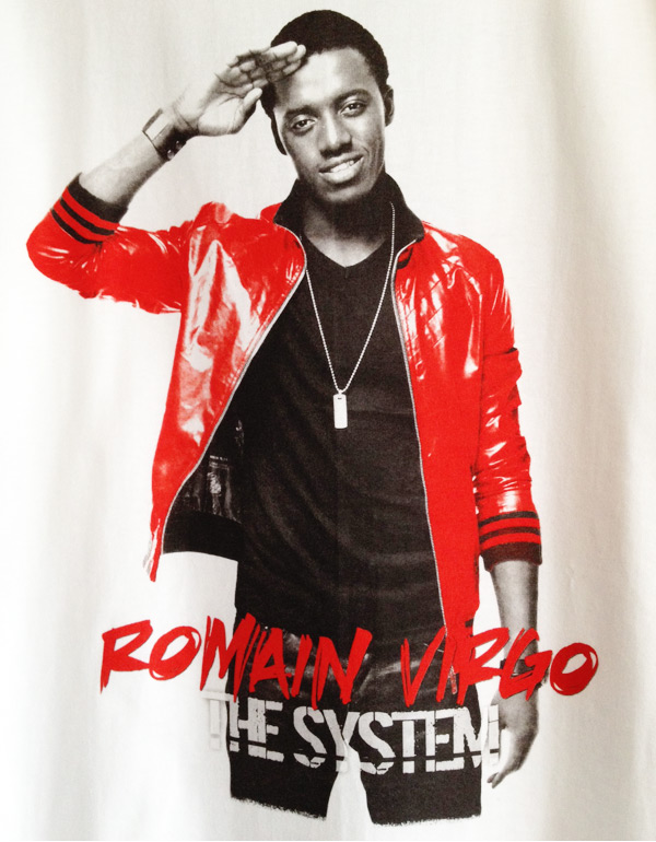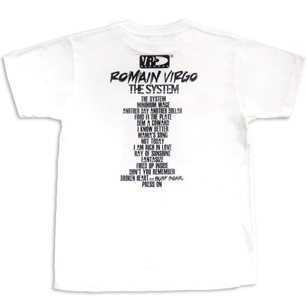 初来日決定! VP RECORDSから今春にセカンド・アルバム『THE SYSTEM』をリリースし待望の初来日が正式決定したジャマイカ最注目シンガーROMAIN VIRGOとのコラボレーションT-SHIRTSが登場。新作『THE SYSTEM』のアートワークのイメージを全面的に打ち出しフロントにはROMAIN VIRGO本人をプリント。バックには今作の収録全曲とVP RECORDSのロゴ・マークをプリント。ネームはVP RECORDS共通ネームを使用。