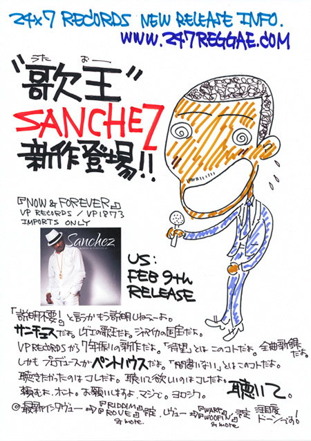 ‡ サウンド・マンから人気シンガーに〜 周りからも「歌ったら?」と勧められることも増え、「うーむ、このままセレクターとしてだけ活躍しててもどーなんだろー。歌ったろか?」と悩んだりなんかして、SANCHEZは最終的に「よーし、歌ったる。セレクターはやーめた。過去を振り向かないで前進あるのみ!」と、シンガーとして活動していくことを決意。で、シンガーとして活動を開始。