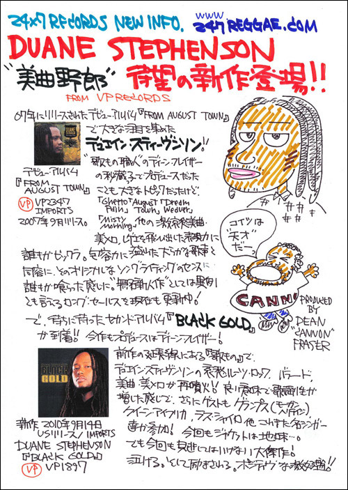 レゲエ・グループTO-ISISのリード・シンガーを経て、07年にVP RECORDSから『FROM AUGUST TOWN / VP2347』でソロ・デビューを果たしたDUANE STEPHENSON。ジャマイカのオーガスト・タウン出身のこのシンガー・ソングライターの才能を見出したのは、ご存知DEAN FRASER! シーンを代表する名サックス・プレイヤーとして国からも勲章を授けられている大物ミュージシャンであると同時に、LUCIANO/SANCHEZ/SIZZLAといった大物スターとの数多くの名作で知られ、また最近ではTARRUS RILEY、ETANAをブレイクさせた名プロデューサーとしても有名。アーティスト育成に優れ、特にシンガーの才能と魅力をいかんなく発揮させることが出来る「歌もの名人」としての評価は絶大。